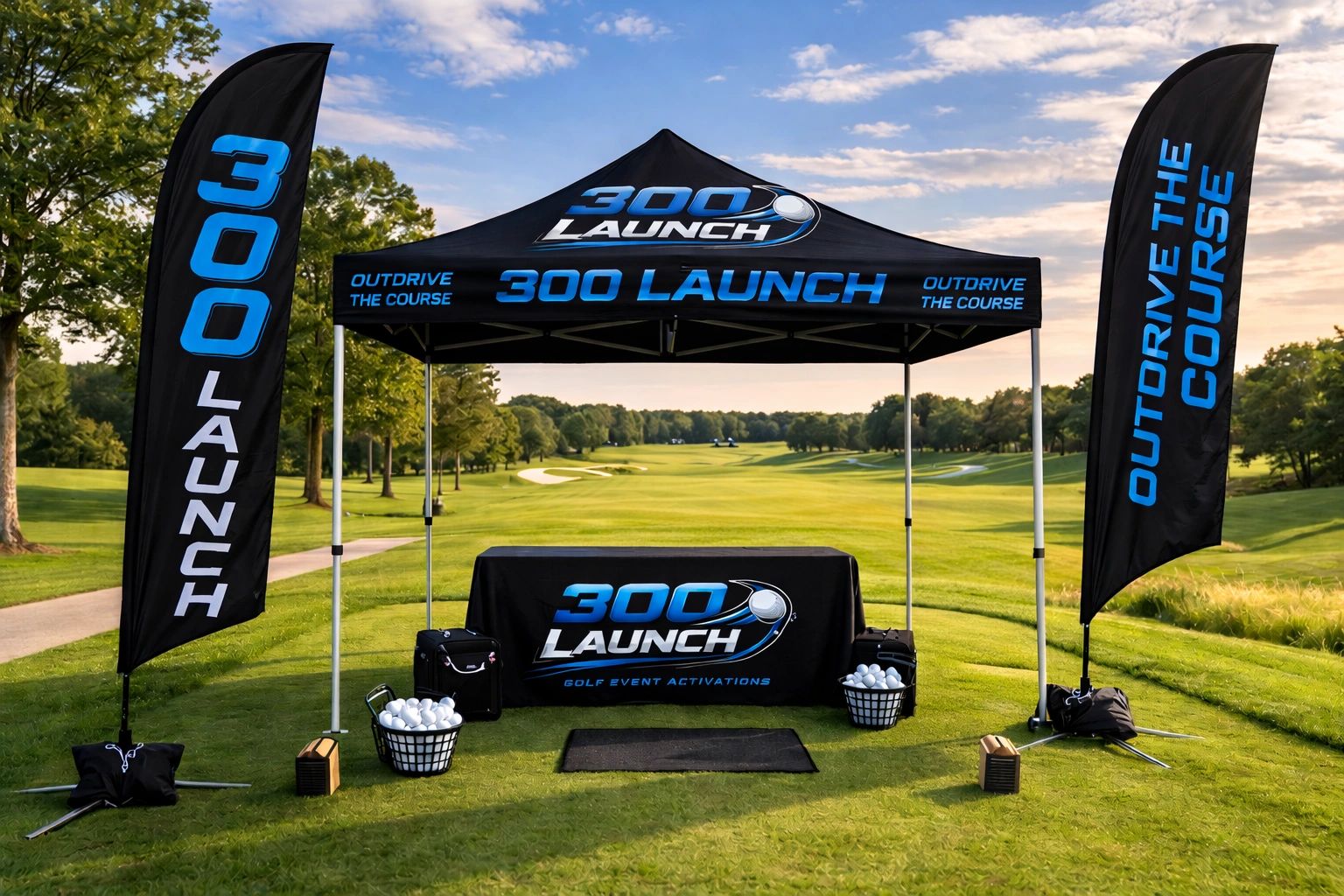 300 Launch is a custom-built golf ball launcher experience that replaces the traditional tee shot with a high-powered, crowd-drawing activation.